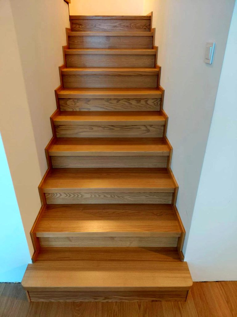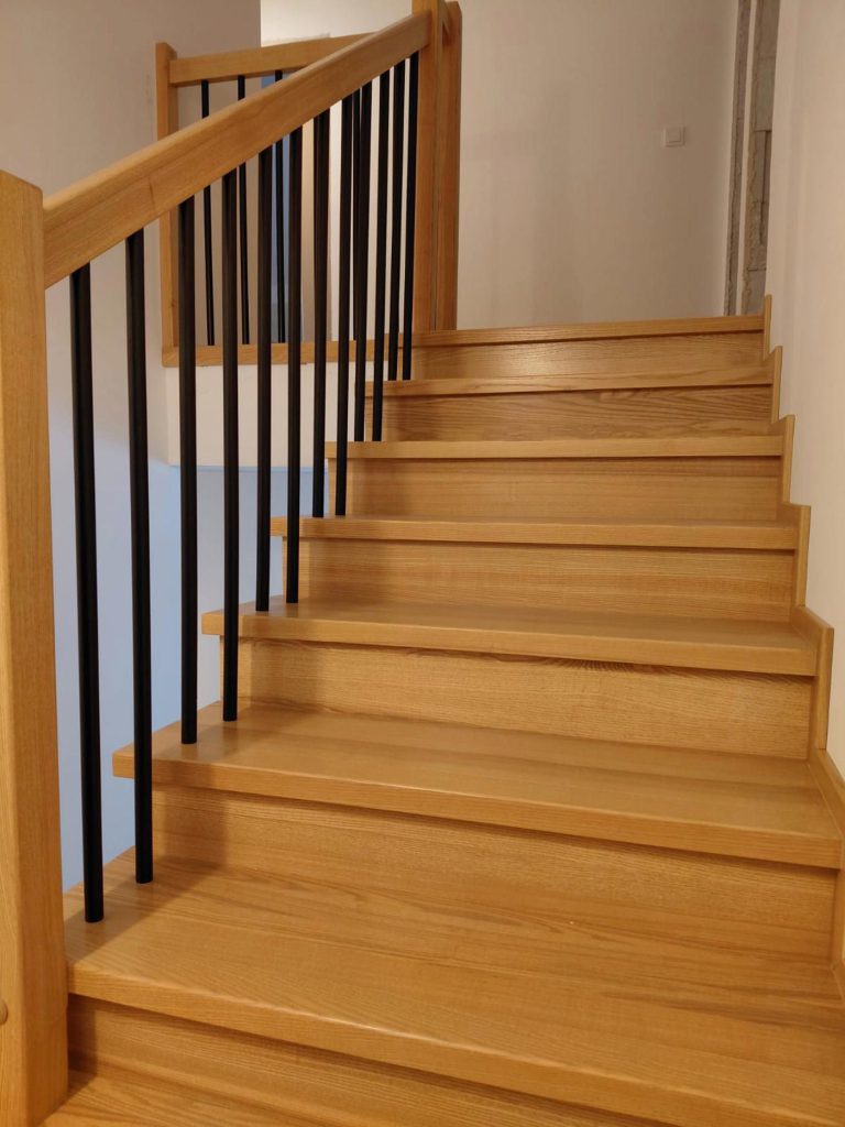 Wykonałem schody drewniane jesionowe, tzw „na beton”. Schody wykonane zostały z drewna jesionowego. Wykończone bejcą w kolorze wybranym przez Klienta oraz zabezpieczone potrójną warstwą lakieru.